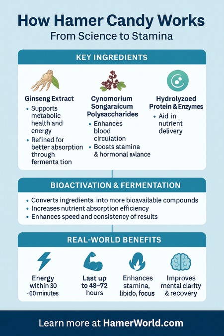 Unlike generic candies, Hamer uses advanced fermentation to refine and combine ingredients like Cynomorium Songaricum and Ginseng. This creates a balanced, synergistic effect—supporting stamina and performance with a formulation rooted in science and optimized through years of development.