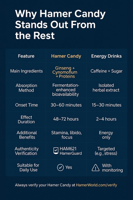 Hamer Candy stands out due to its precision formulation, blending traditional herbal wisdom with fermentation-based bioavailability enhancements. Two powerhouse ingredients anchor its performance: